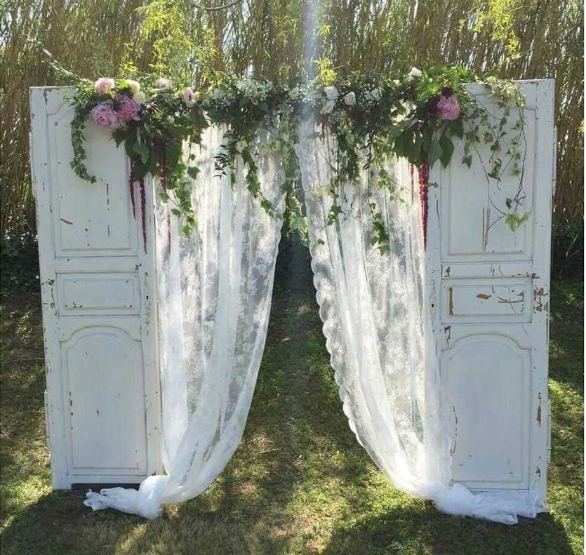 En fond de cérémonie laïque, la porte ancienne crée une entrée symbolique vers votre union.